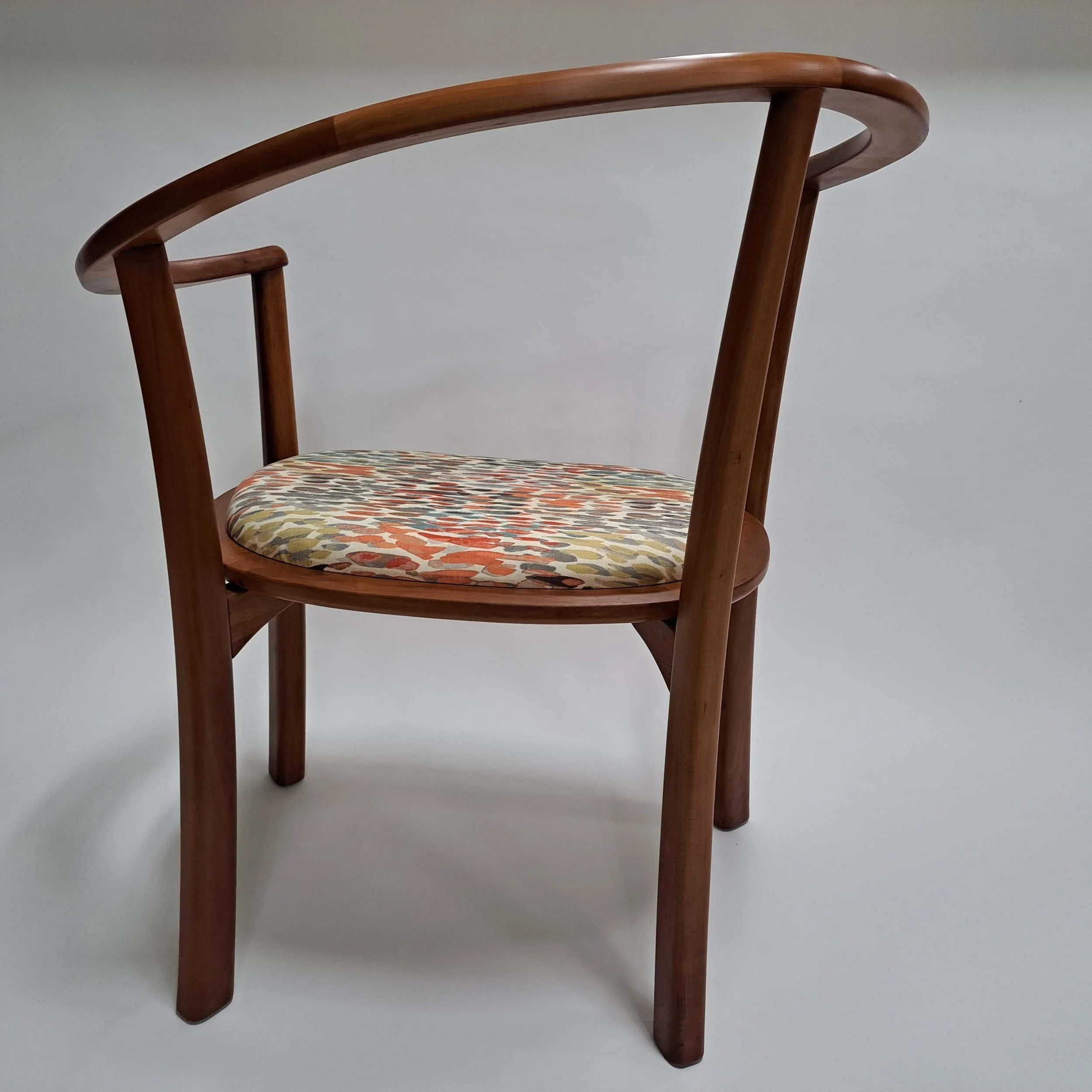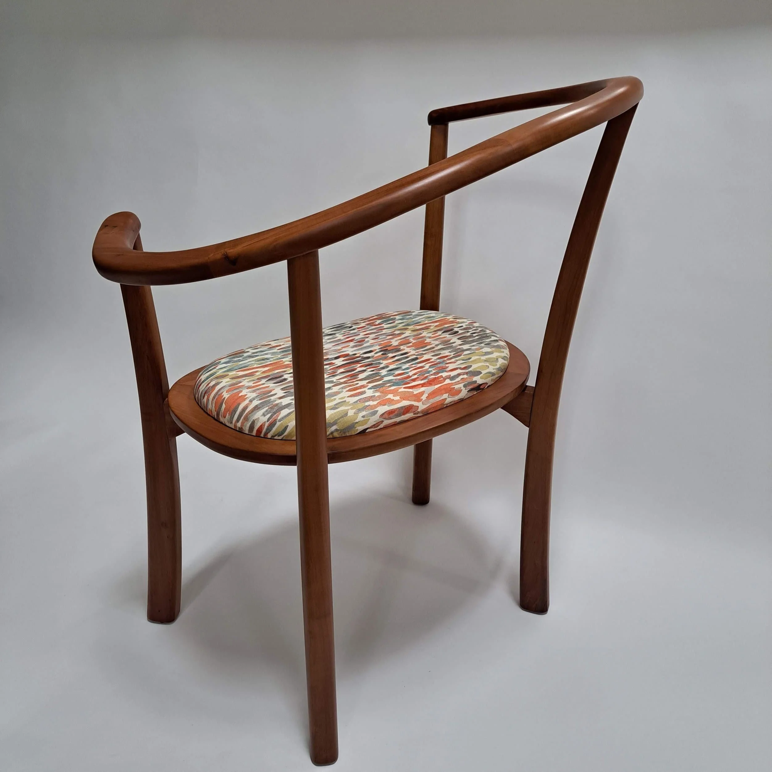 The chair is made of Swiss pear, which is an uncommon yet lovely wood to work with. Like its North American counterpart cherry, Swiss pear gets a darker, richer, color as it oxidizes with UV light.