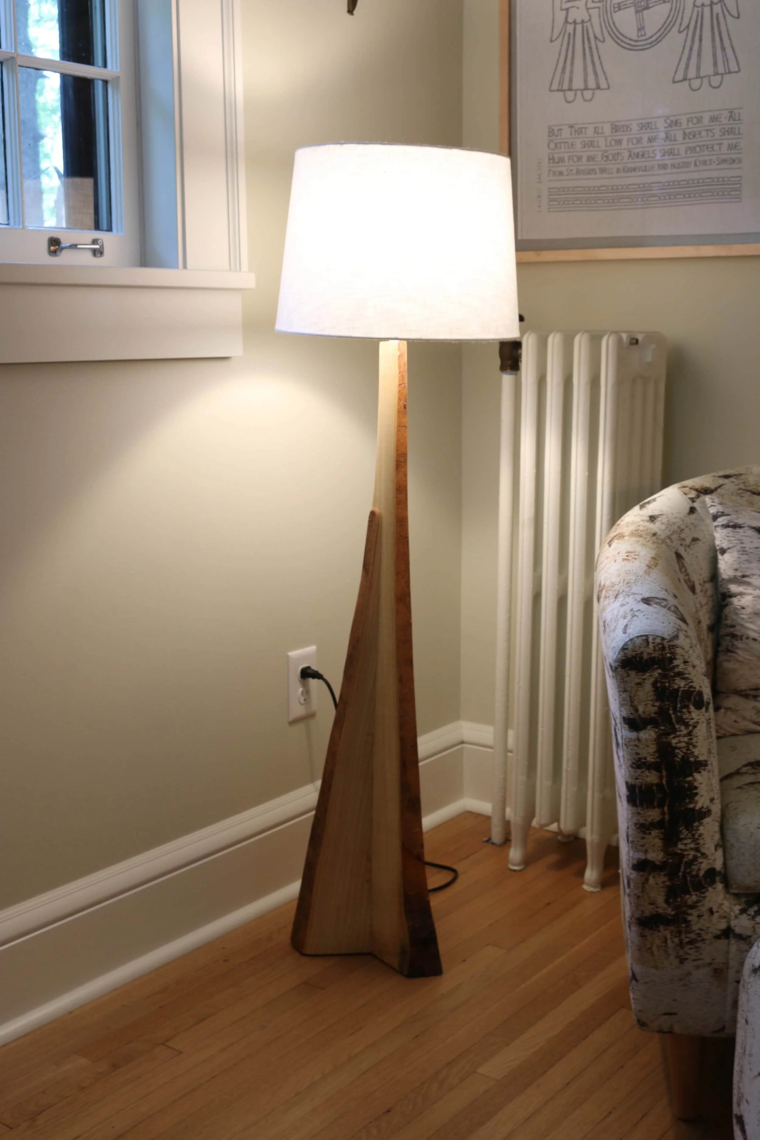 Live edge ash slabs were used to make a buffet top, a matching set of four floating shelves, and a reading lamp.