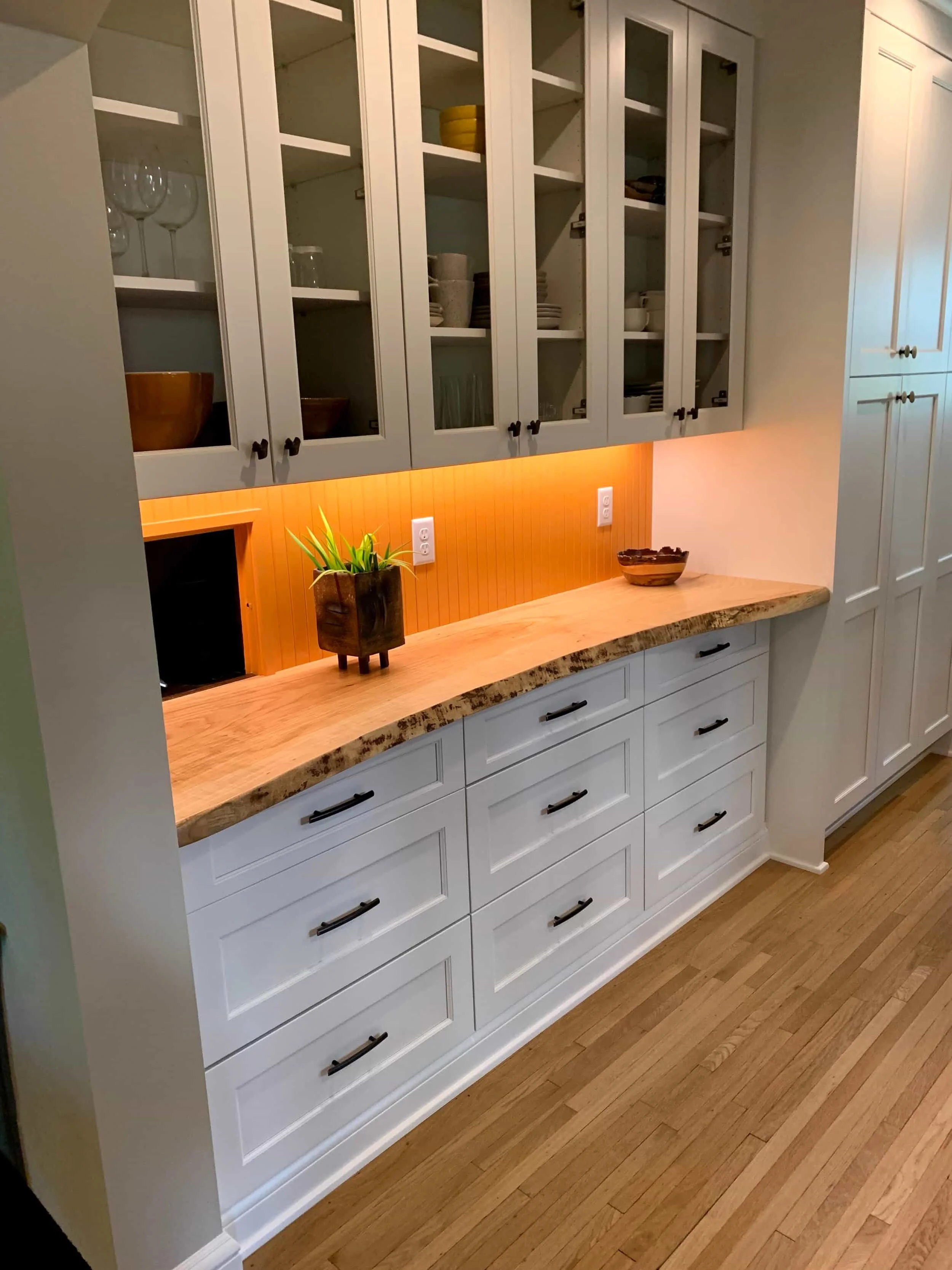 The project started with a live ash slab top for the kitchen’s built-in buffet. Live edge wood refers to lumber that retains the natural, outer contour of the tree along its edges, rather than being milled into perfectly straight, square planks. The bark is peeled off to expose the undulating and often insect bored outer edge. Because the outer edge is new growth sapwood, it is a different color and texture than the inner heartwood.