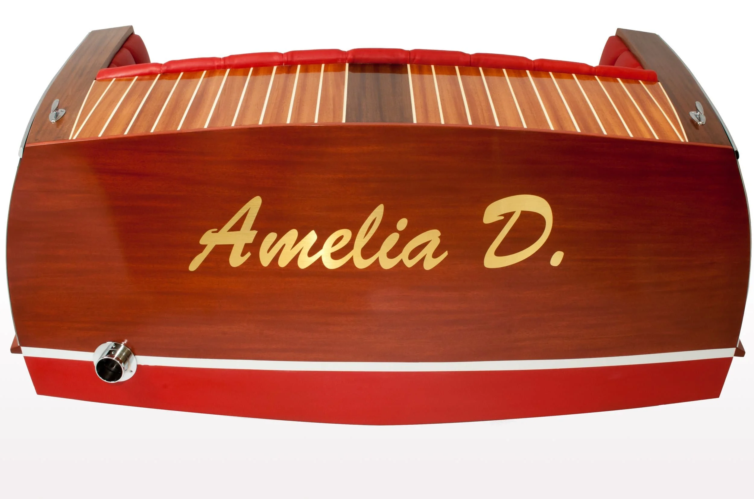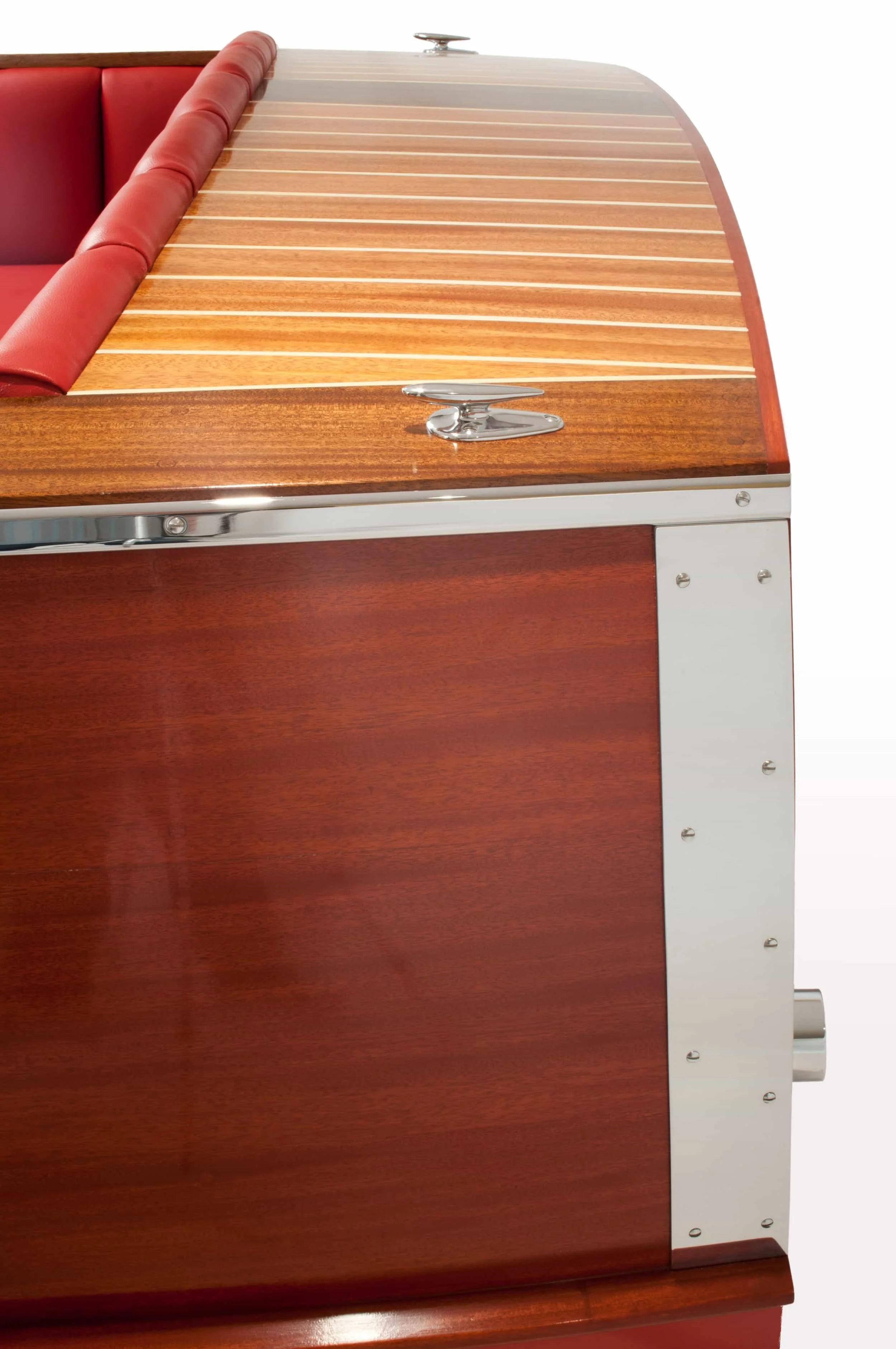 I made this couch to recreate the graceful curves and classic mid-century industrial design of a mid century mahogany runabout. The couch is made similarly to a real boat, with solid mahogany planking laid over an internal ribbed frame. The deck and sides are stained in three different colors, as many of the original boats were. The couch is finished with a high gloss marine varnish. The chromed bump rails, exhaust port and rope cleats give the couch some extra bling. The tuck and roll upholstery adds a classy touch.