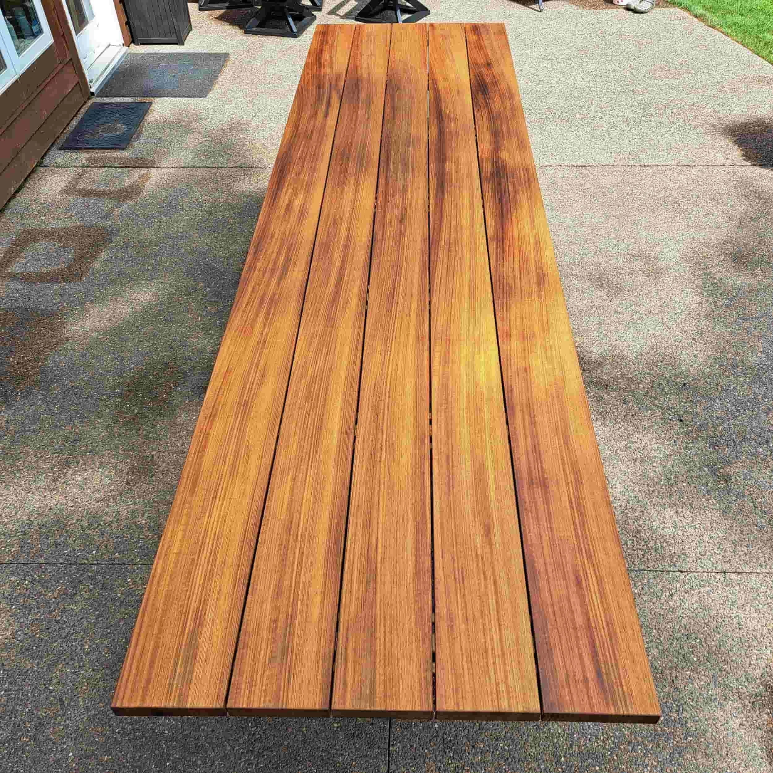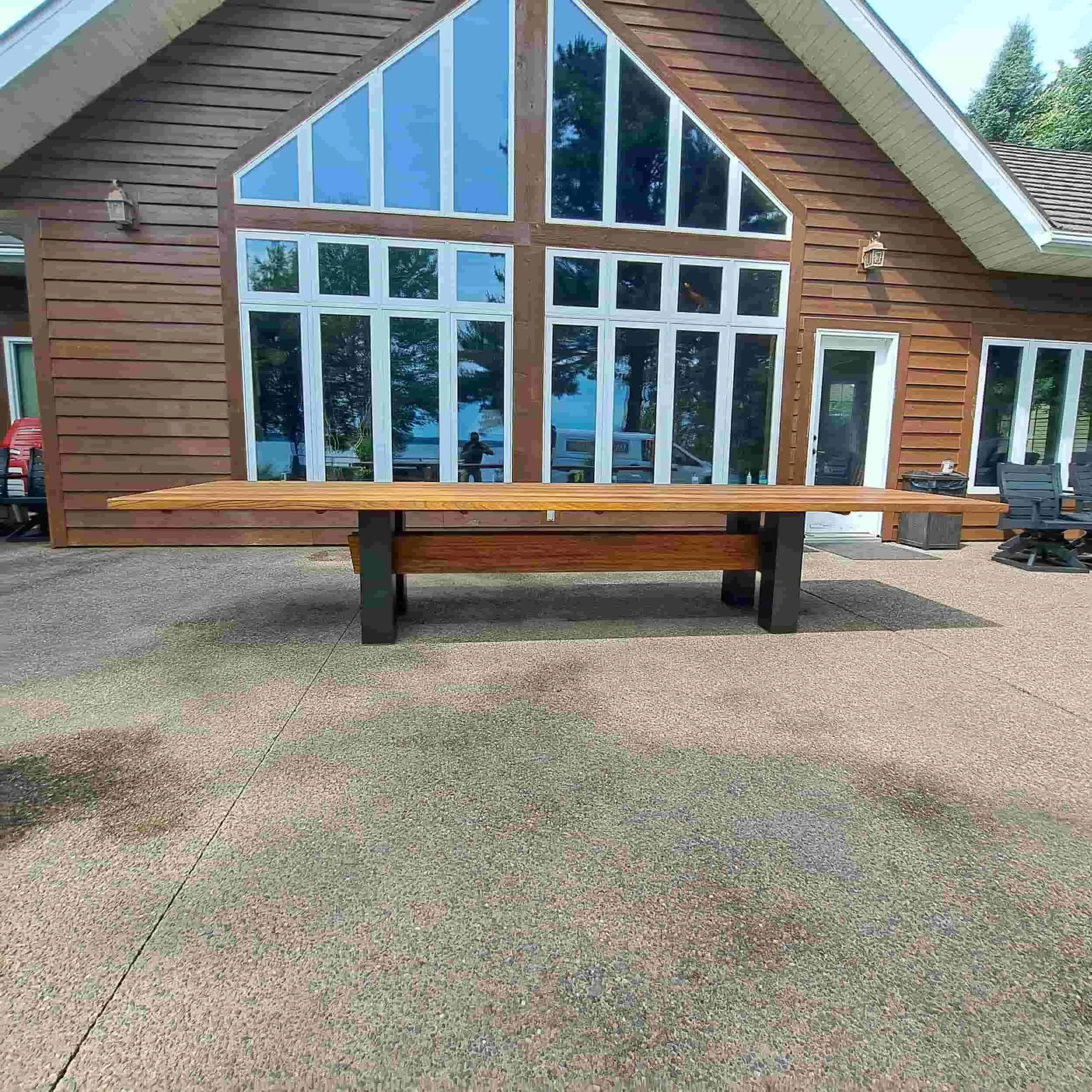I first built a version of this outdoor trestle base dining table for a customer’s Arizona home. They liked it so much that they asked me to make another one for the Wisconsin lakeside cabin. When I asked them what size the table should be, they said they had to first measure the patio. I followed up with an email letting them know that I had secured the lumber and that the planks for 14’ long. The table size question was then answered, “make it 14’ long.” The five boards bring the width to 48.” Delivering the table required renting a dual axel trailer, and four stout lifters on the customers’ end.