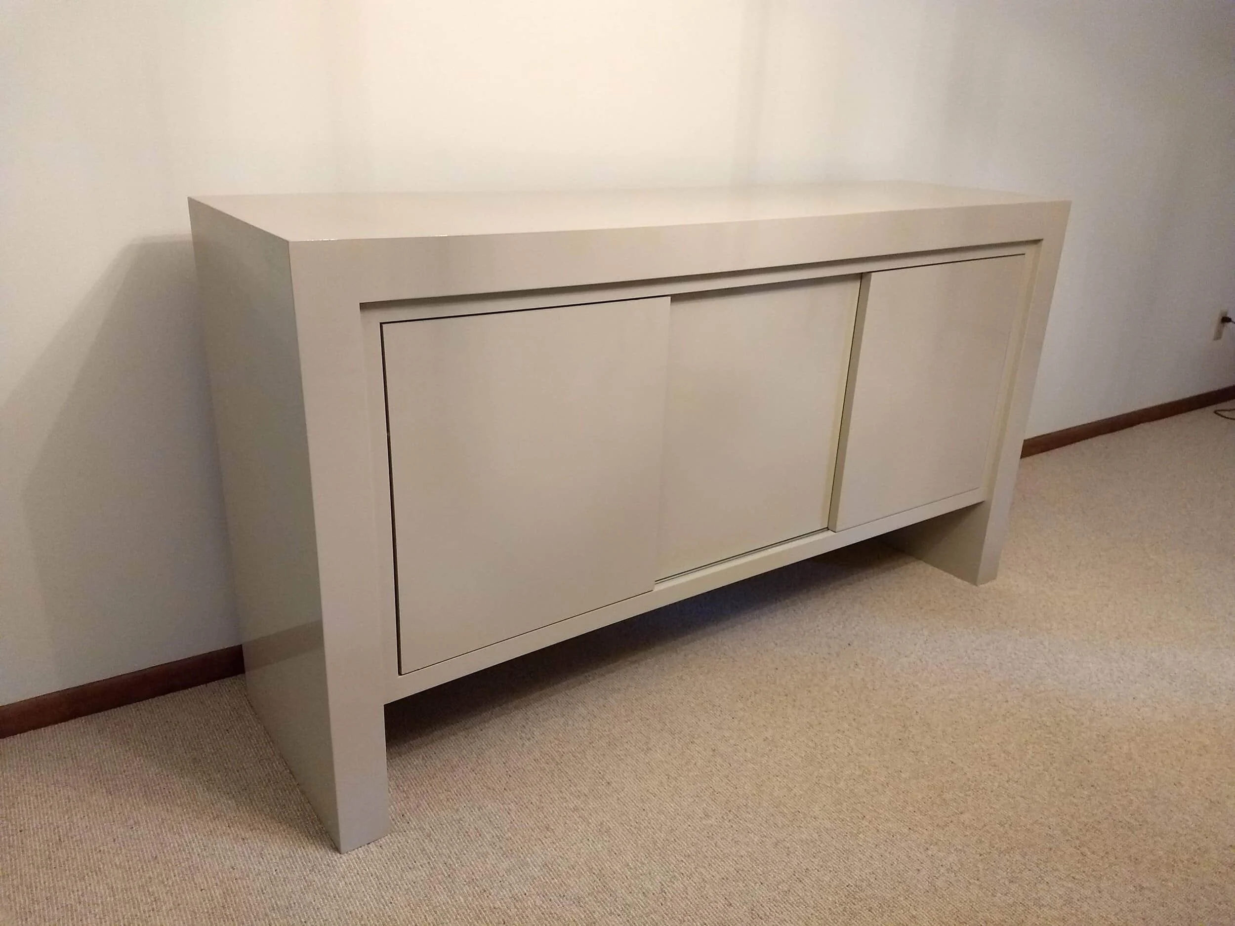 The buffet has a high gloss painted finish. This was done in four steps, similar to how cars are painted. Primer was first sprayed on. This was followed by multiple coats of pigmented automotive paint. The paint was then topcoated with automotive clearcoat. Once the clearcoat cured it was polished to a high gloss using polishing compounds and an electric buffer.