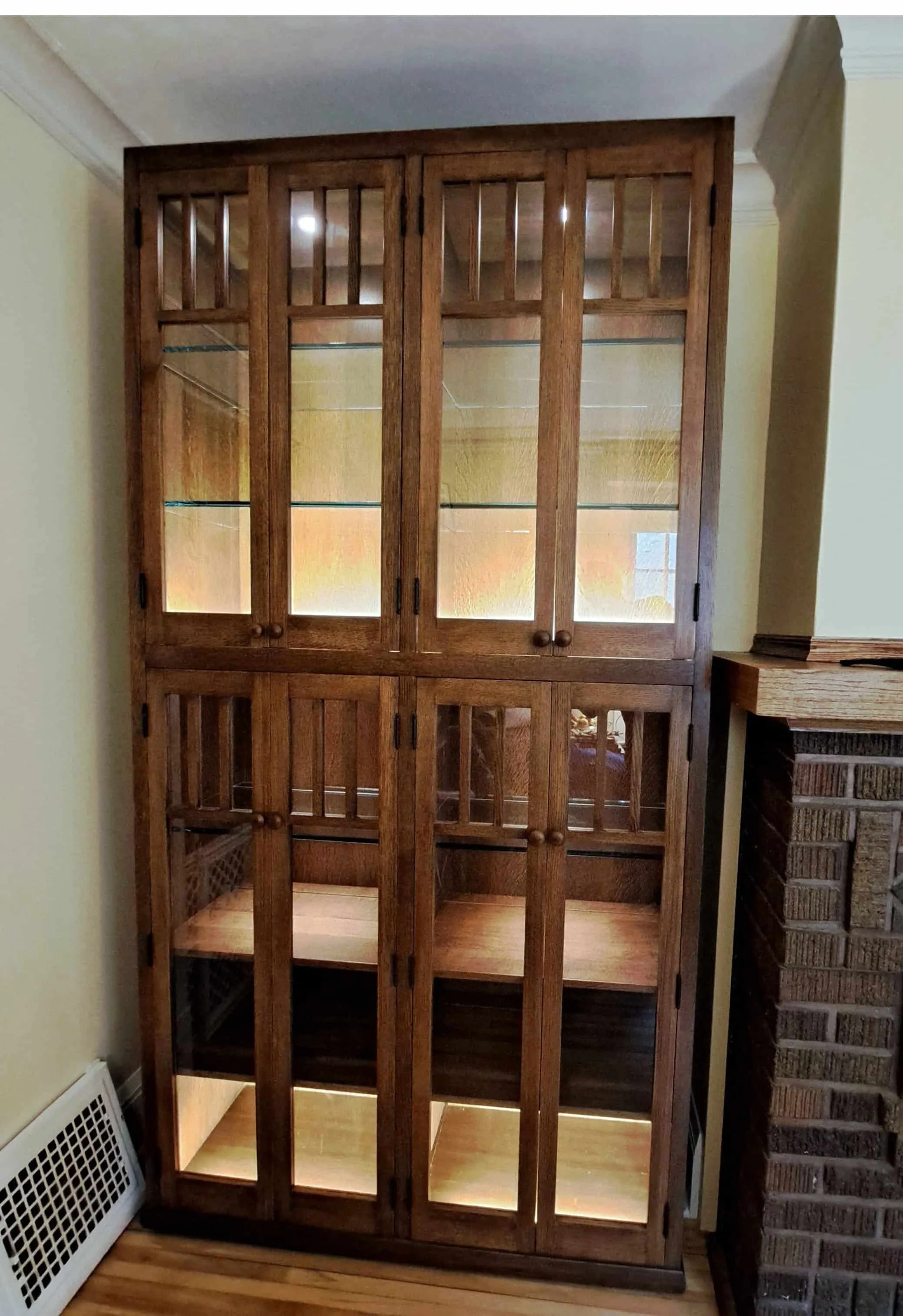 This cabinet was made to display the customer’s family heirloom china and glassware collection. It was built to compliment her cozy Arts and Craft style home. The cabinet is very large, measuring 53.5” wide X 95” high X 18” deep.