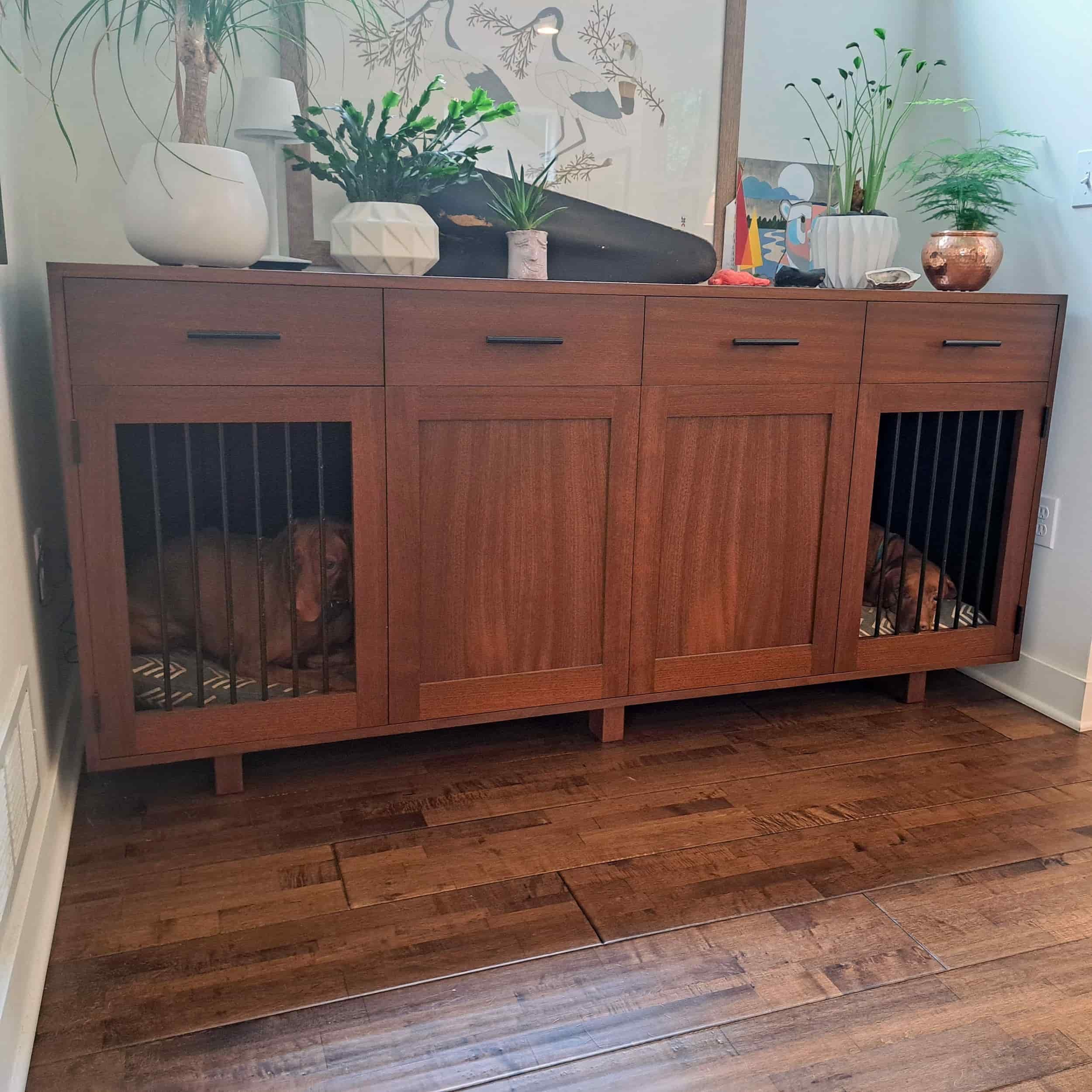 The kennel has four drawers along the top. Instead of cabinets below, which would be found in a typical credenza, the two center panels are fixed. On the ends are doors with metal bars. The inside of the cabinet is the kennel. The customer has two dogs. There is an openable divider in the middle of the kennel that allows for creating two separate kennel halves, or one long contiguous kennel. The back of the kennel is made of slats with space between them, thus providing the needed ventilation.