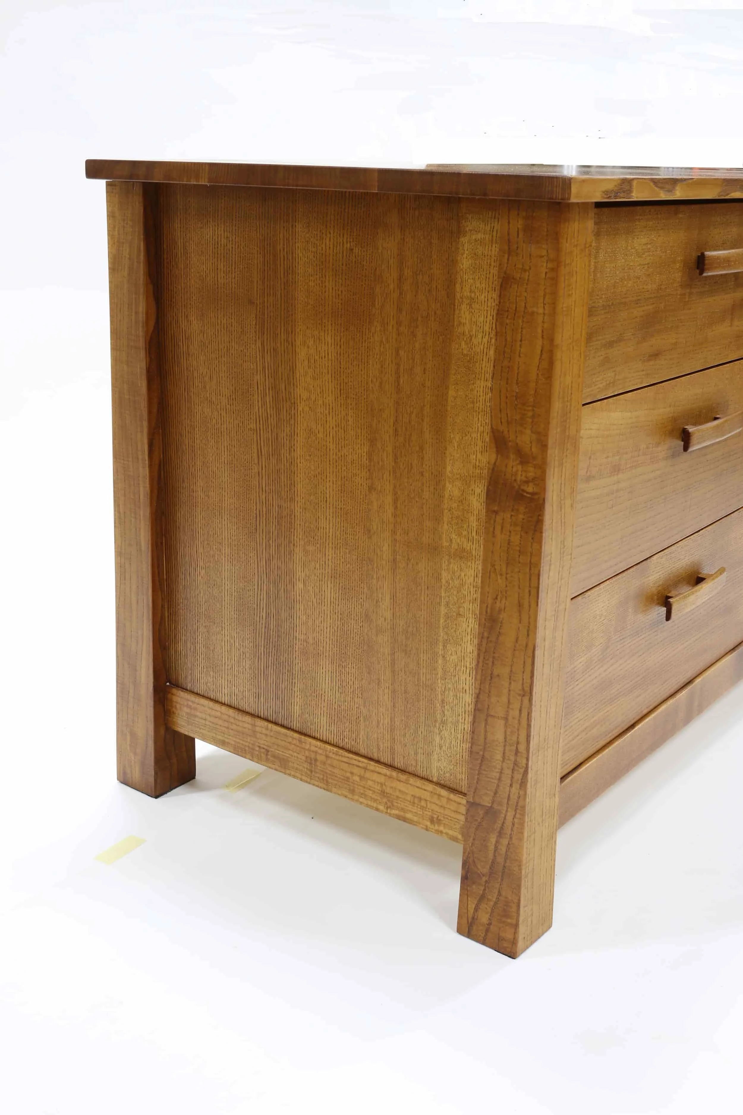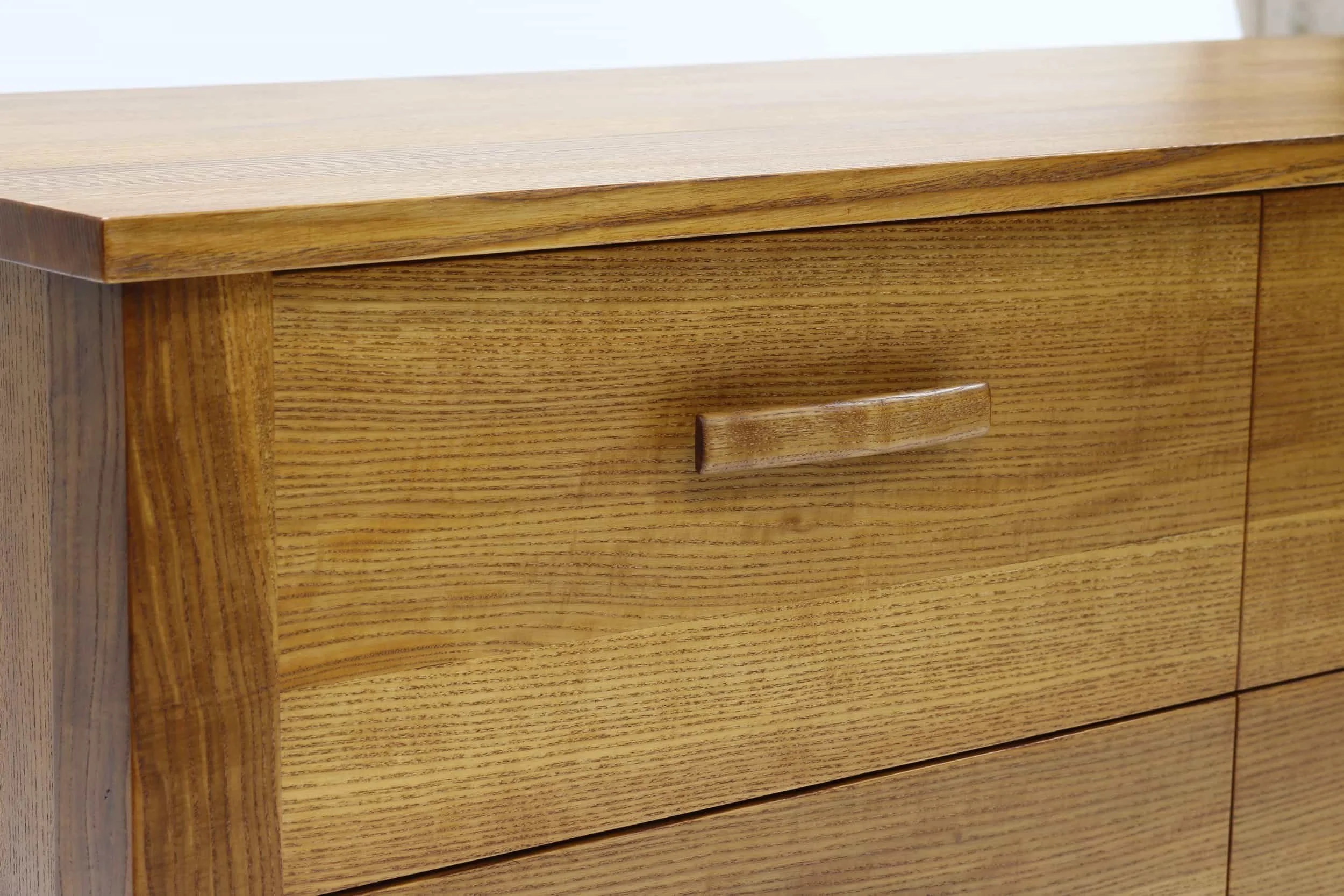 The dressers and nightstands are made of quarter sawn ash. Quarter sawing is the process of cutting the boards with the saw cut perpendicular to the annual rings. This results in board faces with a tight, uniform and parallel grain pattern. All pieces are dyed and finished with an eco-friendly penetrating wipe on finish