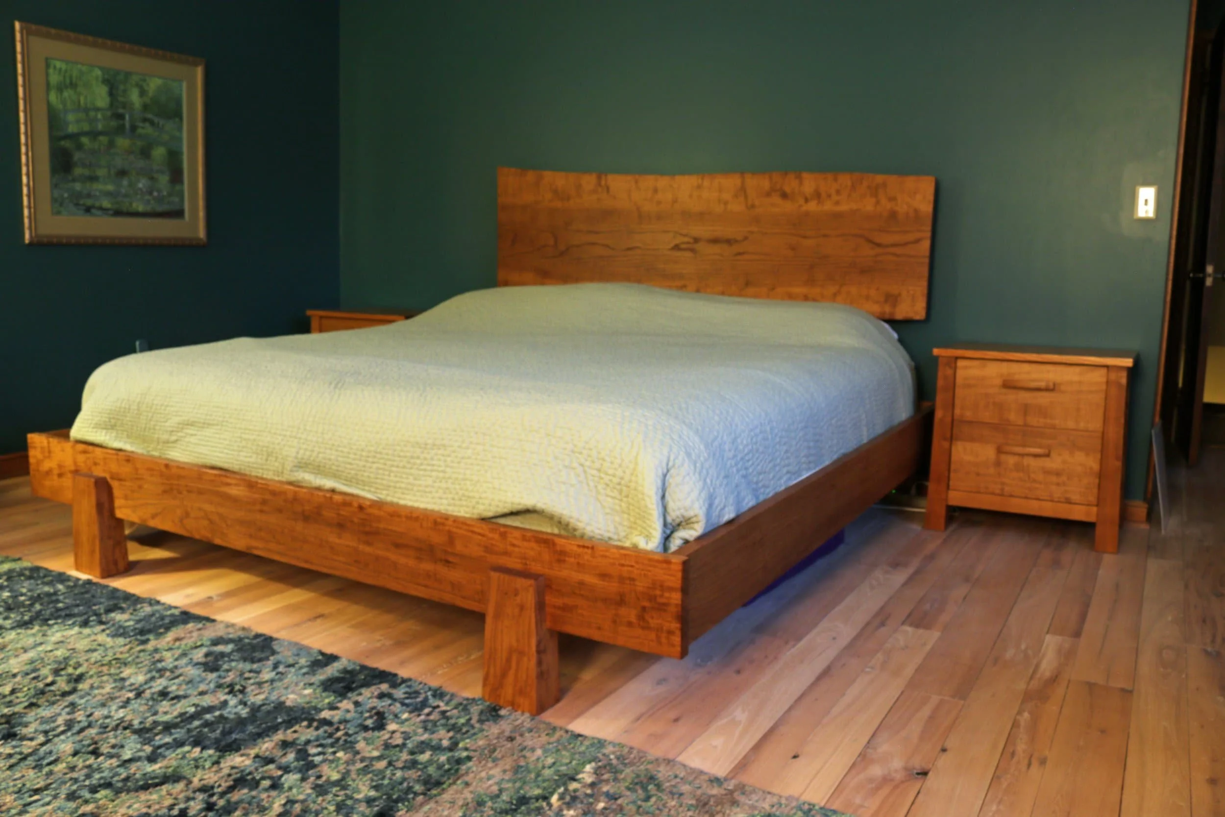 The customer first commissioned the bed. She wanted a low platform bed, as is the Japanese style, but with the proper height to make getting in and out of bed easy on aging bodies. Using temporary blocks, we experimented with placing the mattress at different heights. This was then used to set the height of the bedframe. The bed prominently displays a large live edge ash slab for the headboard.