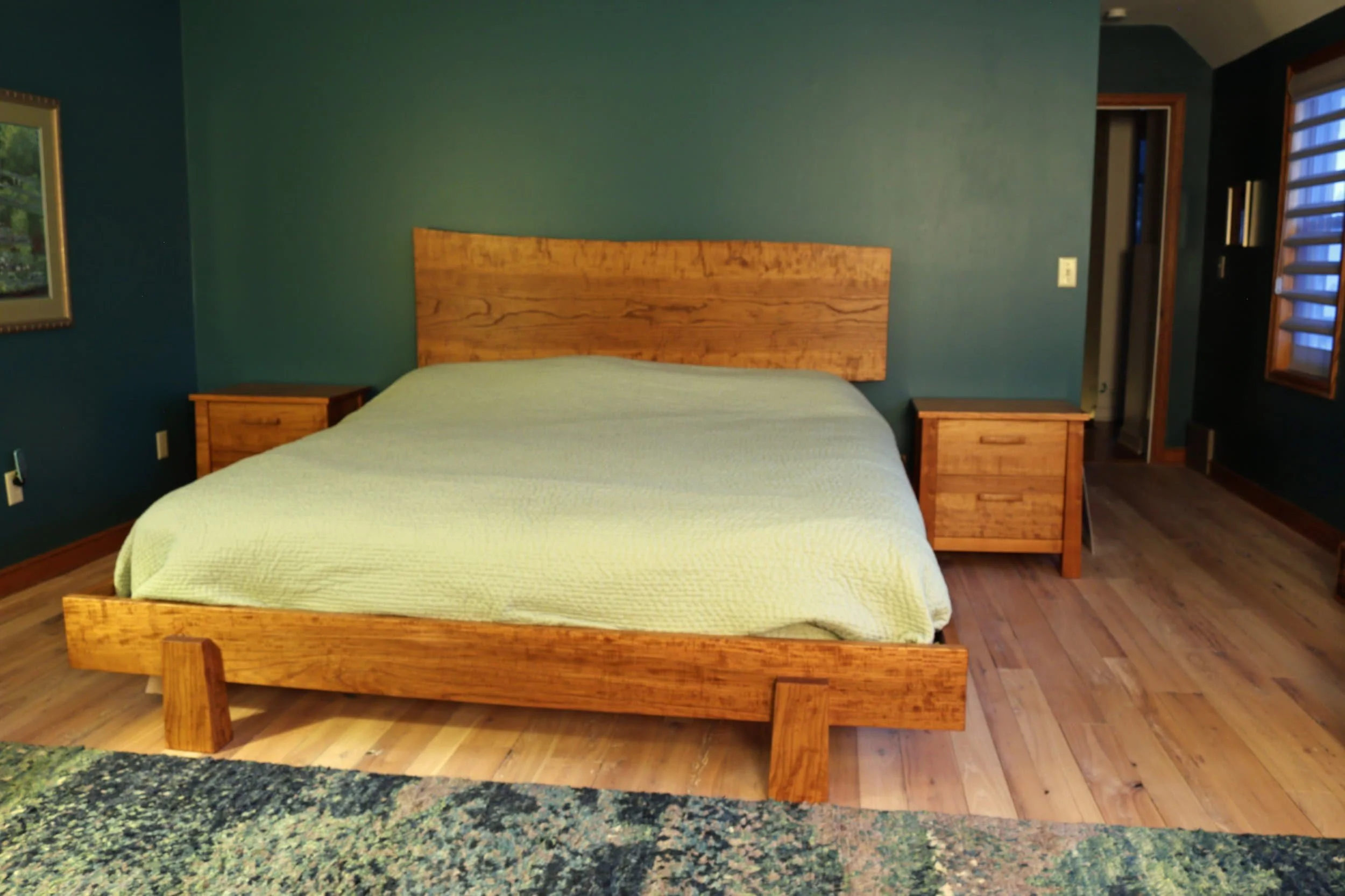 This bedroom set was designed and built to complement the customer’s collection of beautiful Japanese lamps and accessories. The customer once lived in Japan where she assembled her collection and got a taste for Japanese design. The bedroom set consists of a kingsize bed, two dressers, and two nightstands.