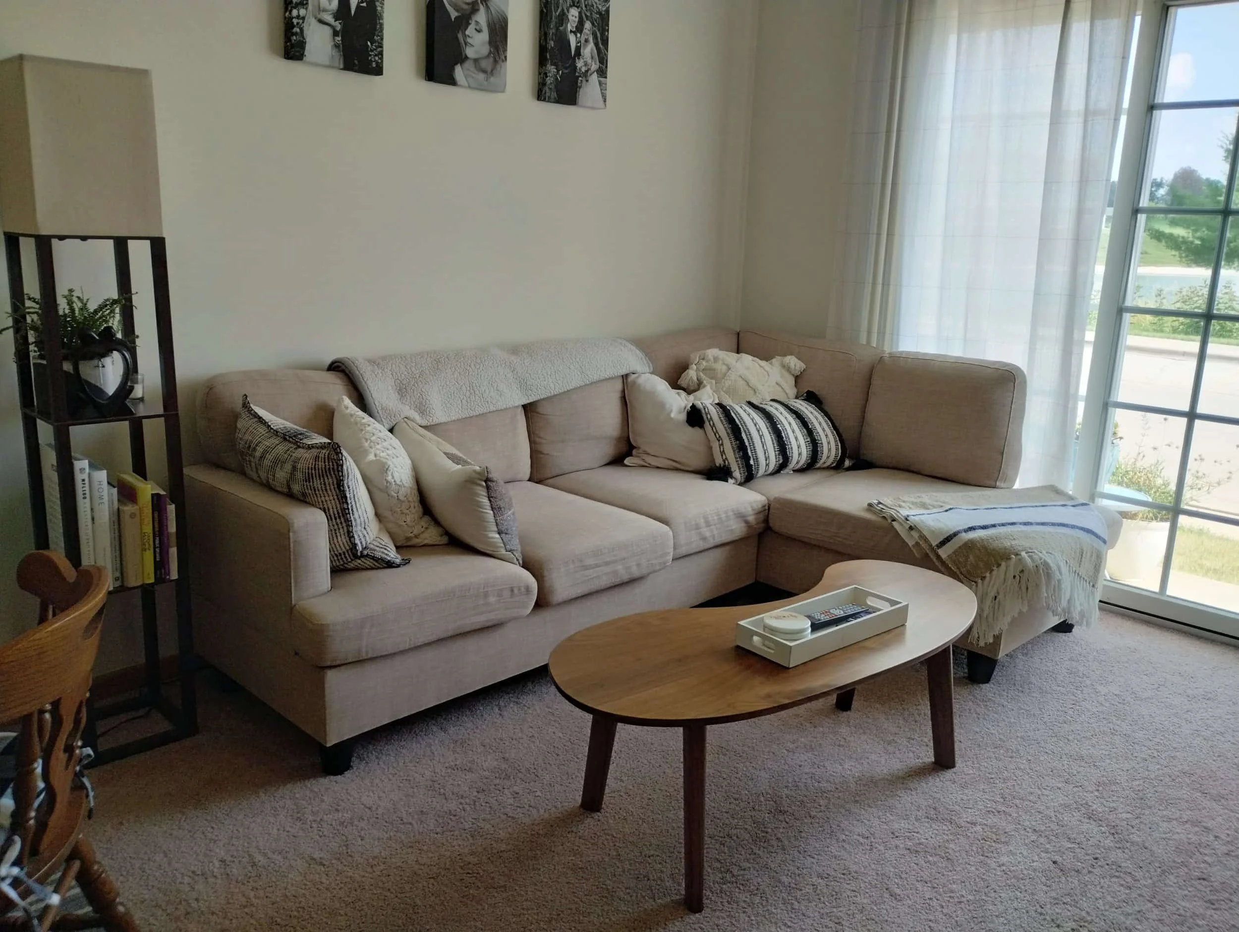 This solid walnut coffee table features a classic Mid-century Modern amorphous shaped top. The table’s simple clean lines accent the living room furnishings.