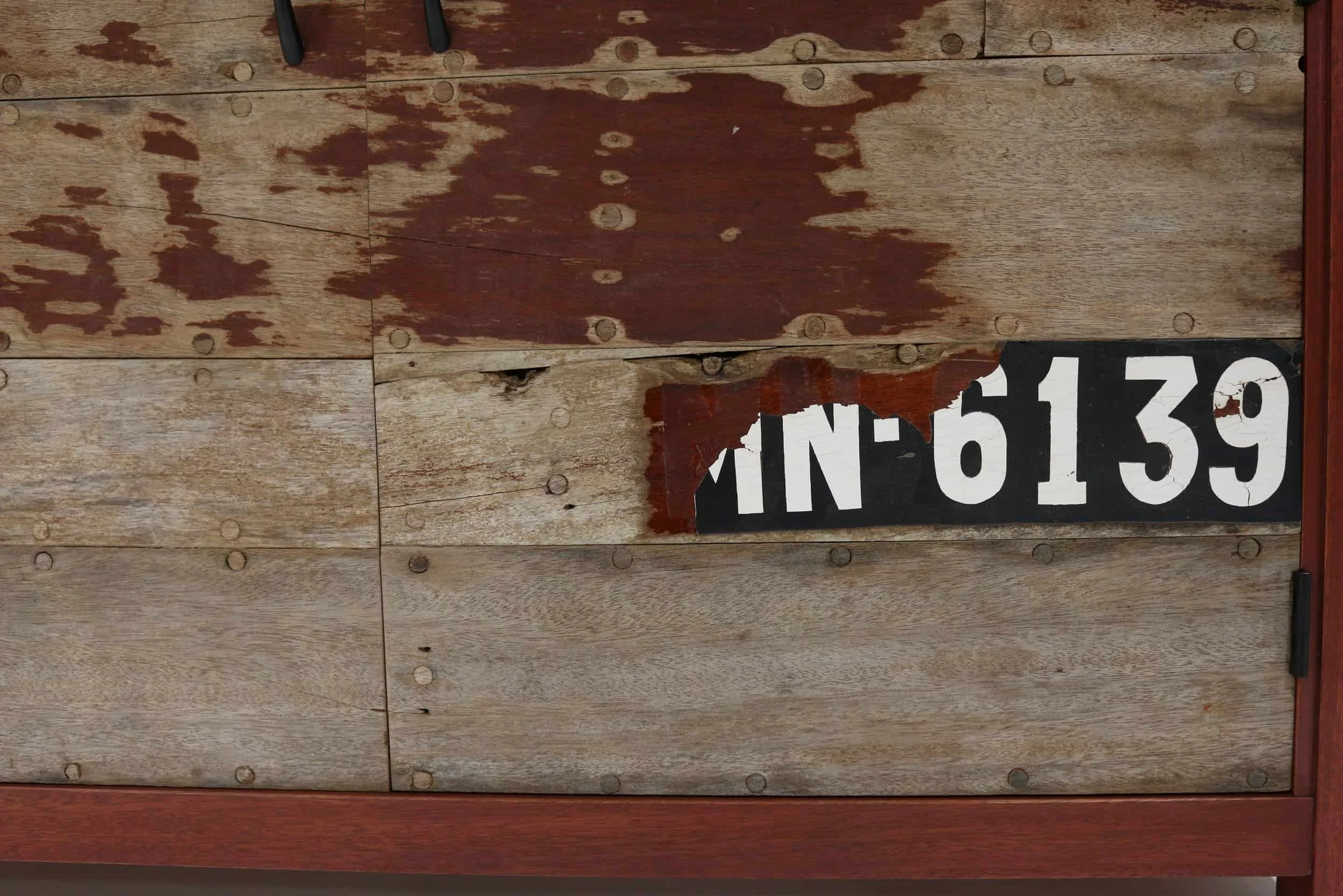 Much of the wood on this 1935 Dunphy Water Phaeton was no longer seaworthy, and the idea occurred to my customer to salvage some of the restorable wood and create a cabinet for the front room of his cabin. My customer commissioned me to build a new cabinet which was clad with wood from the boat. This cabinet tells the story of the boat from top to bottom. The top of the cabinet is made of wood removed from the aft deck of the boat and retains the patina of years of outside weathering. The sides are weathered and original as well, the planking being arranged just as it was on the side of the boat. Some of the factory finish remains, and the boat's original registration number panel was also used. Finally, the back of the cabinet displays side planking that has been restored with its original factory finish in order to show what the boat looked like when new.