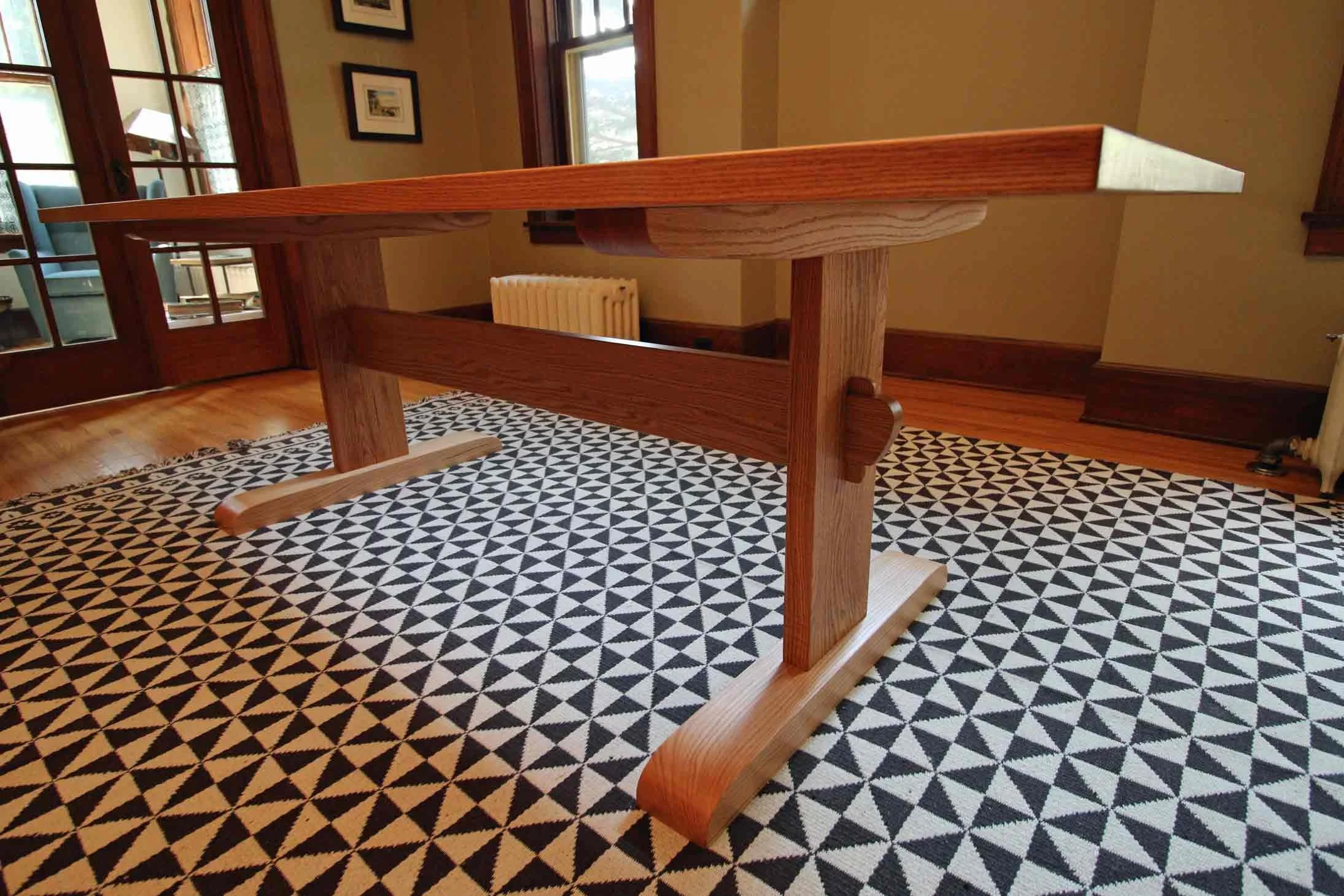 The classic trestle base adds visual depth to the piece, and evokes the Arts and Crafts style of the house. The table is finished in clear varnish, with no stain or dyes altering the appearance of the wood - the wood stands for itself.