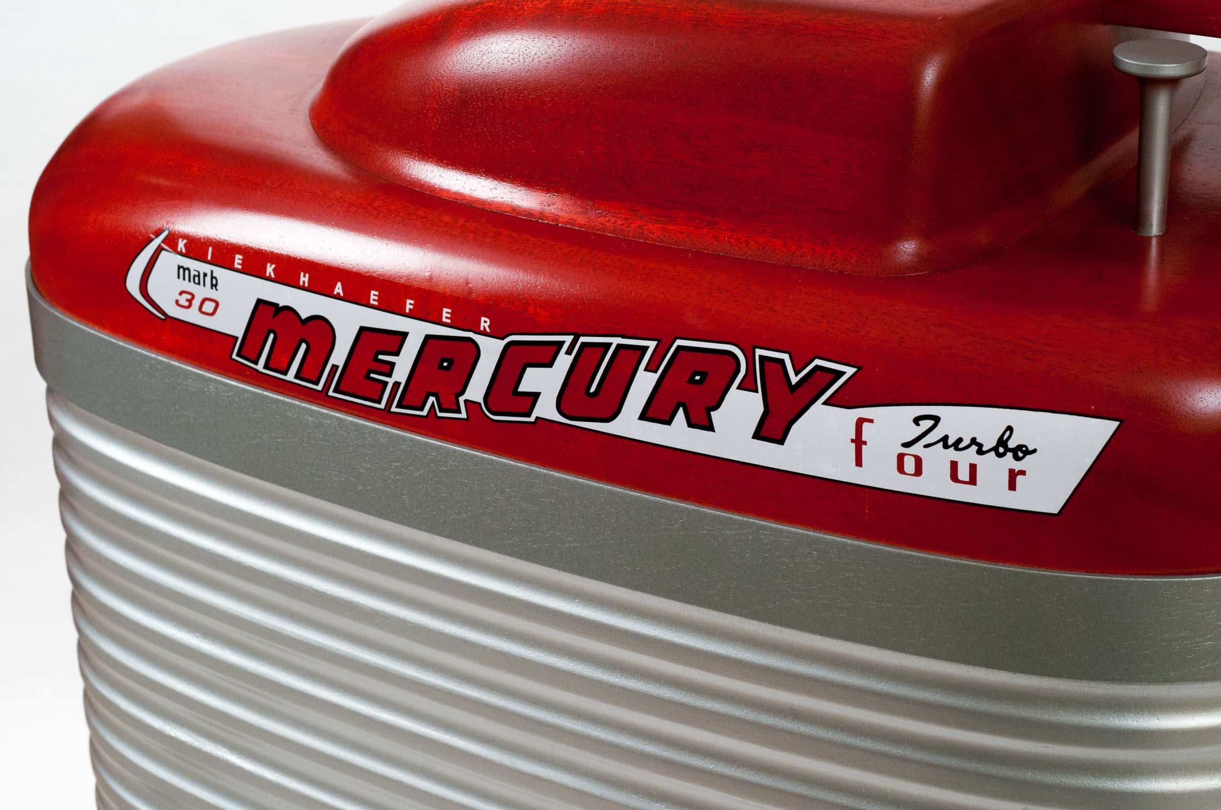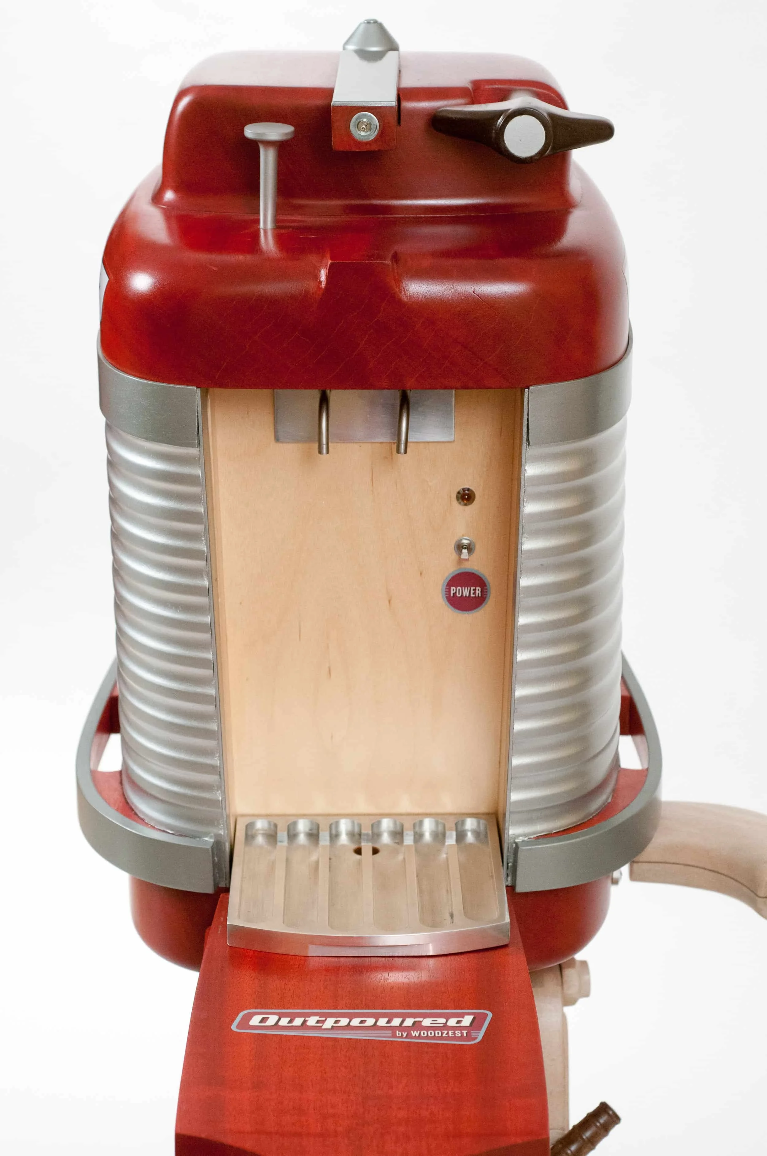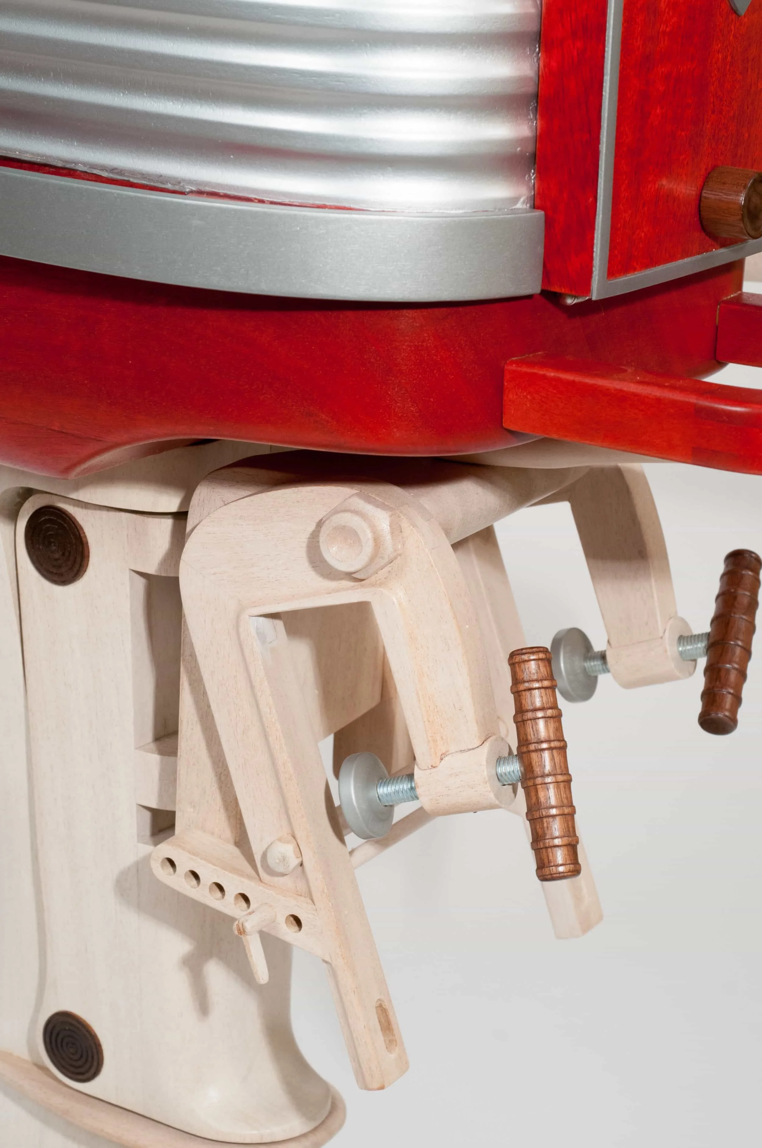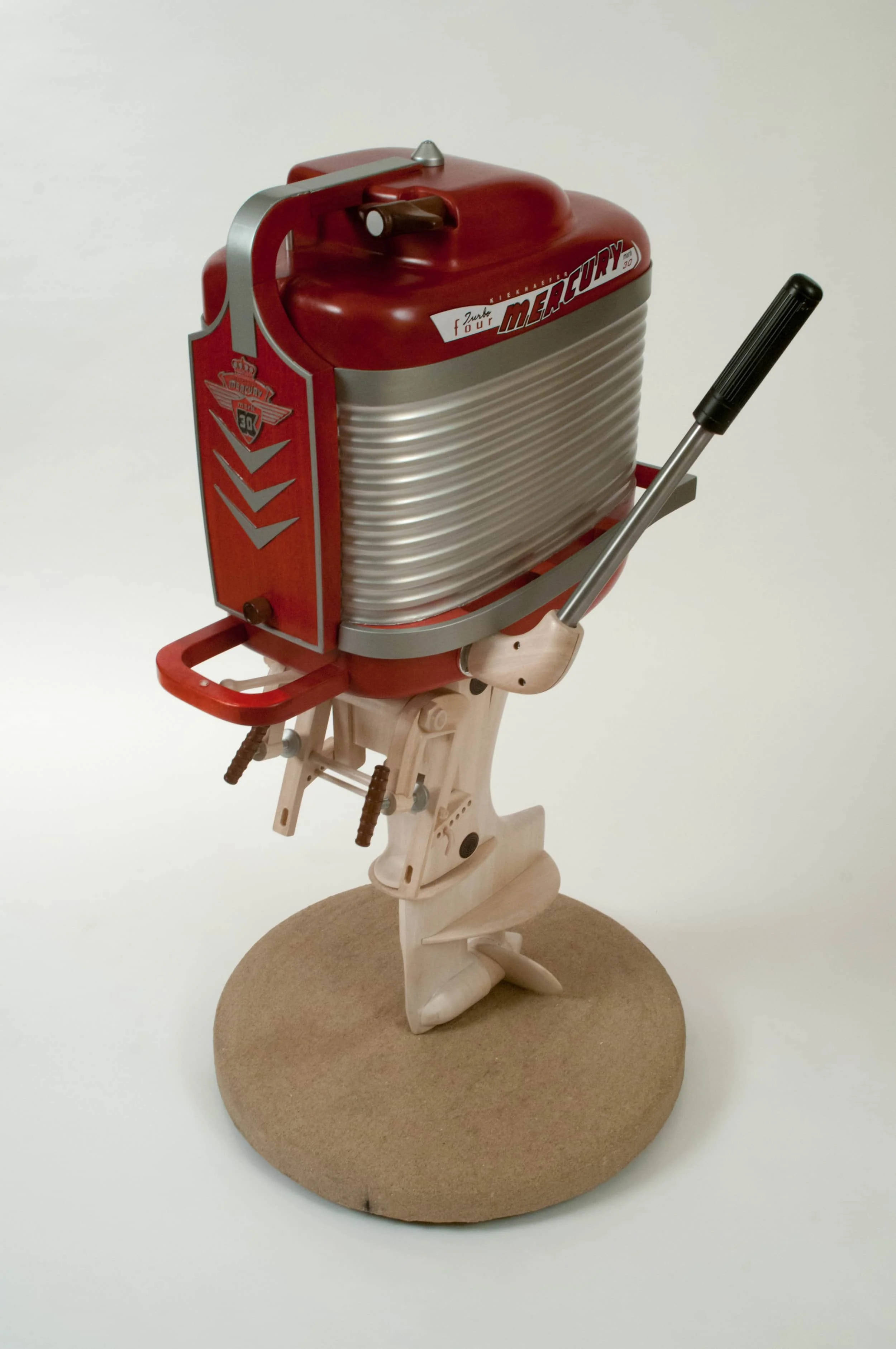 I displayed a related item, Grandpa’s 10 Horse, at an Antique and Classic Boat Association (ACBS) show. A show attendee came up to me and said “When I pull on the tiller I want a beer to come out.” That comment inspired this piece, the Outpoured. It is a mahogany facsimile of a 1957 Mercury Mark 35 that functions as a beverage dispenser.