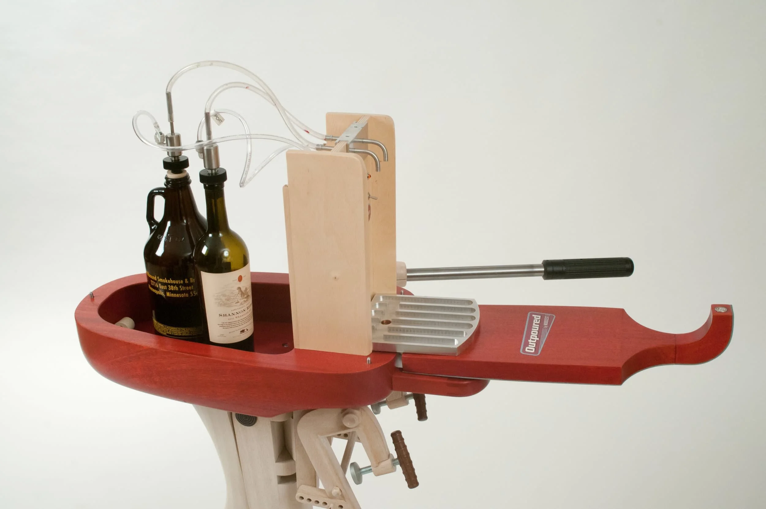 The motor holds two beverage bottles. Practically any beverage can be dispensed using a variety of containers - wine bottles, beer growlers, liquor bottles, soda bottles, etc. A rechargeable battery powers two air pumps. The pumps pressurize the beverage bottles, which pushes the beverage out the siphon tubes through the beverage lines to the nozzles. The forward and reverse gear lever switches the electrical power from one bottle’s pump to the other, letting you dispense from either the port or starboard nozzle when the variable speed throttle is turned.