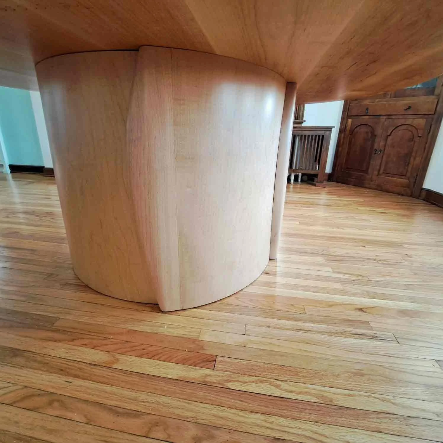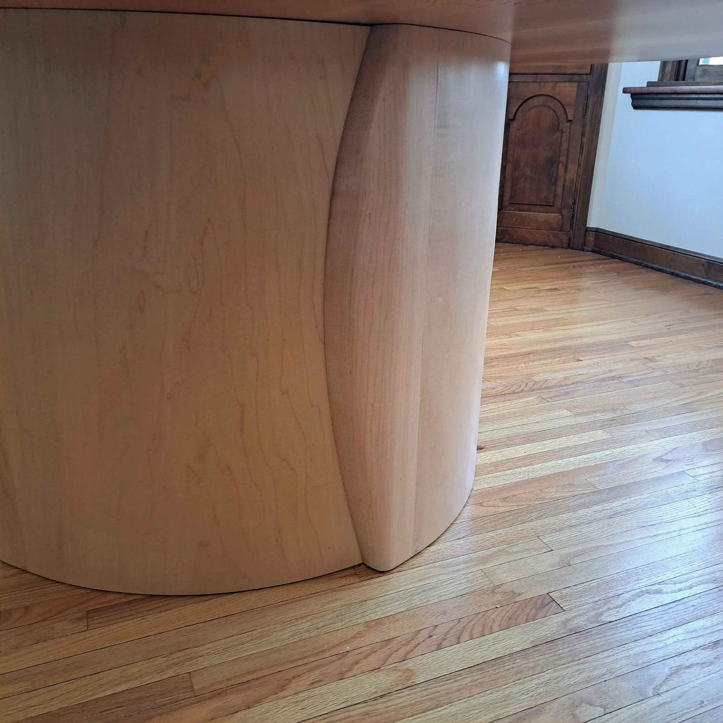 This 70” diameter round table fits the square dining room space perfectly. The natural maple finish is a bright focal point, while complimenting the darker woodwork and oak flooring. The table features a base made of five overlapping curved panel ”petals.” This design was based on the customer’s inspiration. I worked with her on multiple iterations of models to solidify the final design.