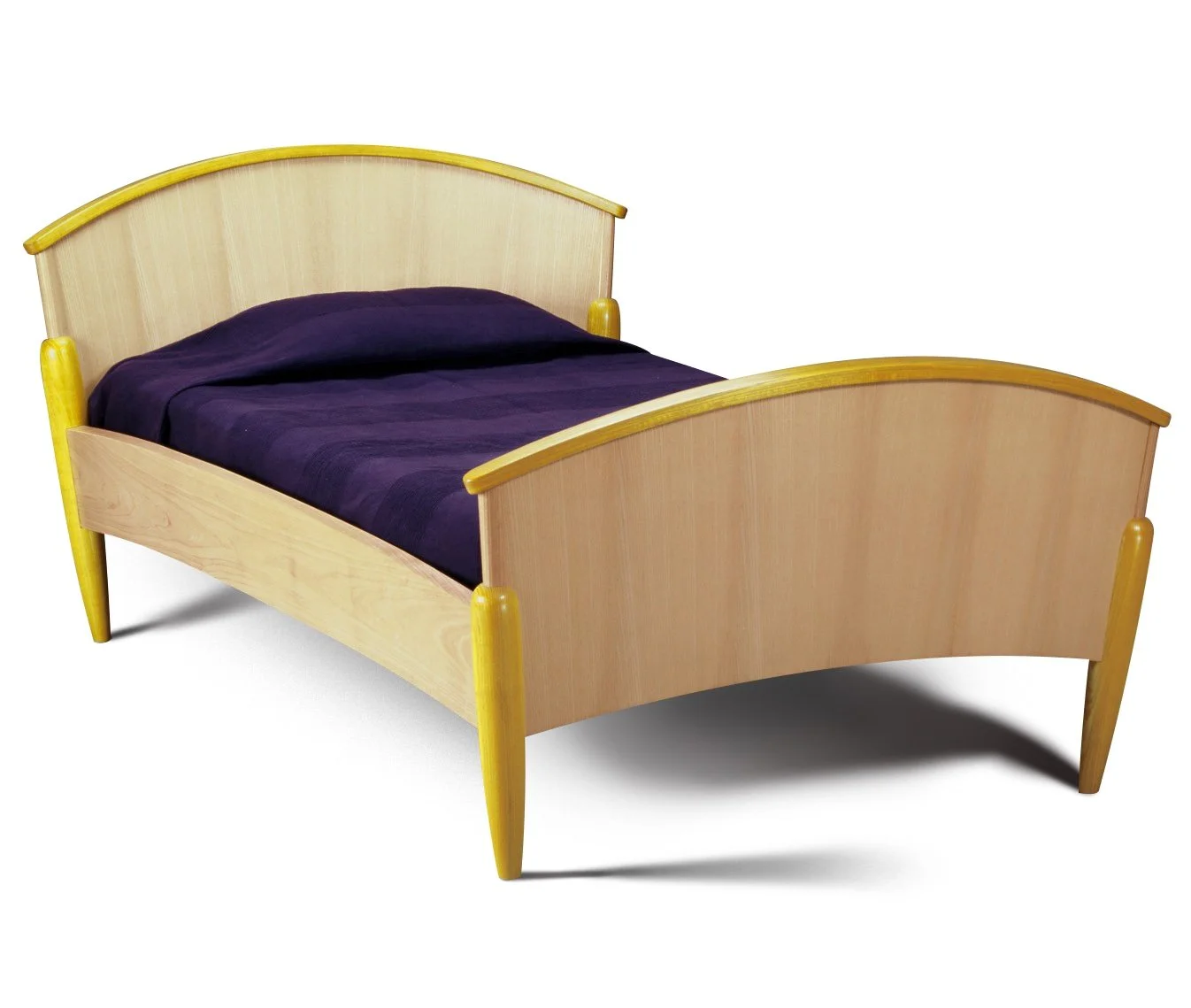 The bedroom set consists of two matching twin beds, a desk, desk chair, bench and bookcase. The pieces are supported by turned rocket shaped legs which are tilted at a slight angle, giving the impression that they’re about to take off. All of the panels are curved. The only flat surfaces are the desk top and the sides of bed rails. These curves further accent the visual upward lift of the design, and they add a whimsical flare.