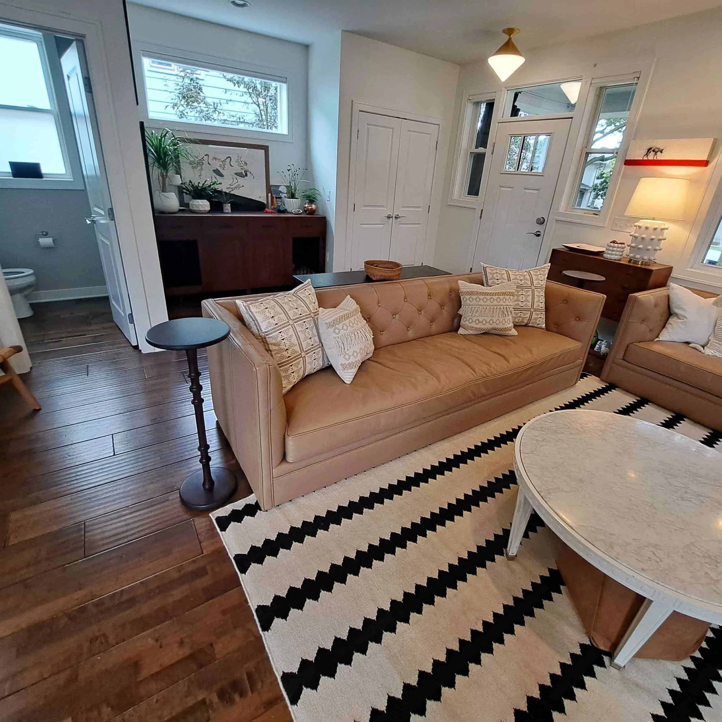 These two matching round tables are made to overhang the sofa arms. The subtle grain pattern of the mahogany works well, as it doesn’t visually overpower the tables.