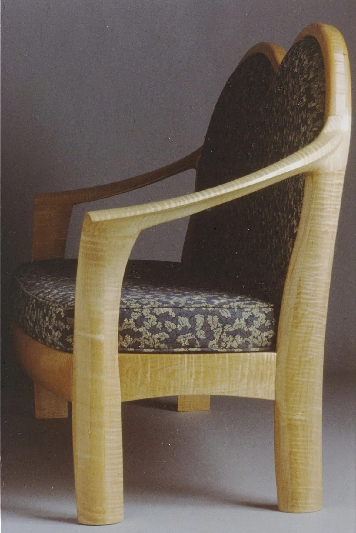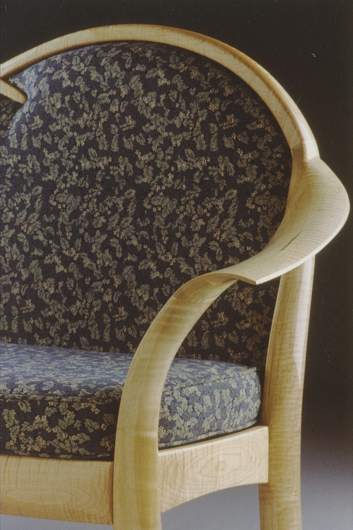 The sofas are made from tiger maple. Tiger maple is a highly sought-after, figured lumber known for its dramatic, shimmering stripes that run perpendicular to the wood grain, often called curly or flame maple. It is primarily sourced from soft red maple. In addition to furniture, it is used for violin backs and guitar bodies, thus leading to another common name, fiddleback maple.
