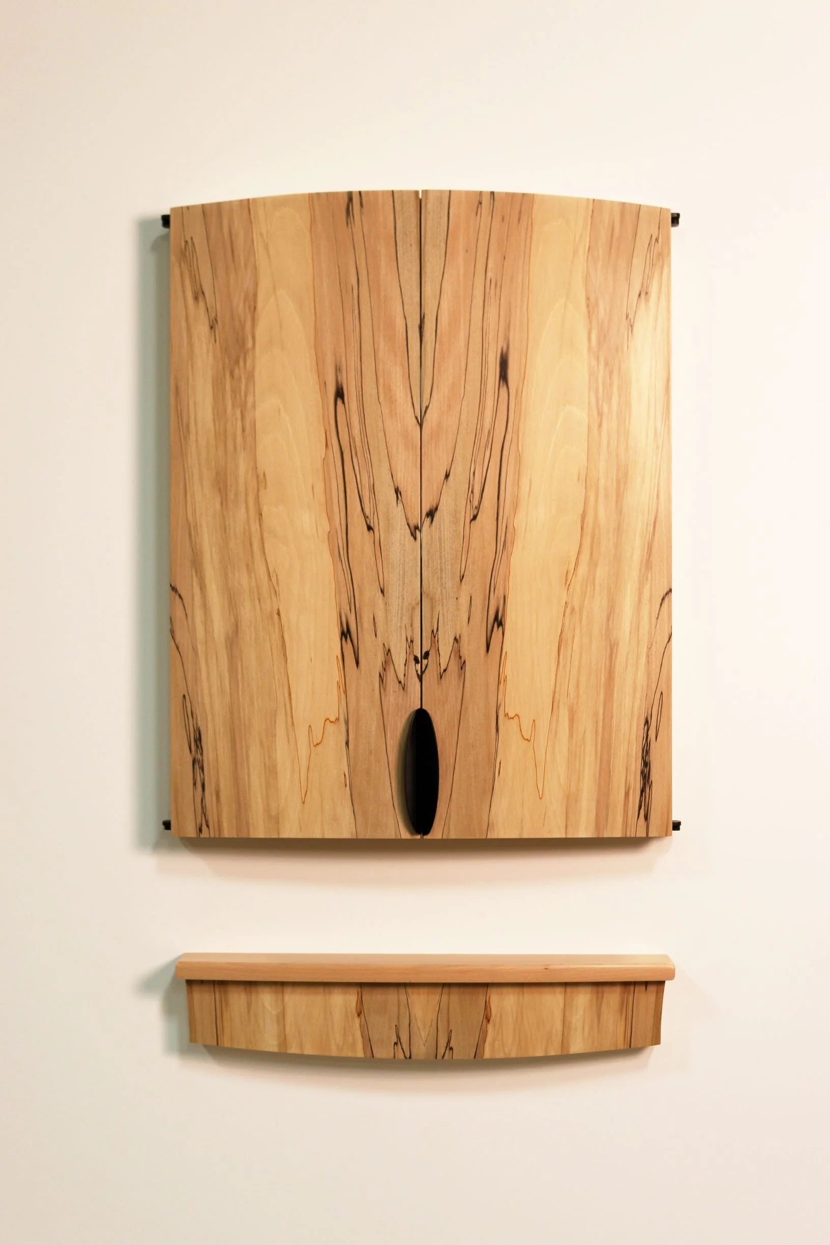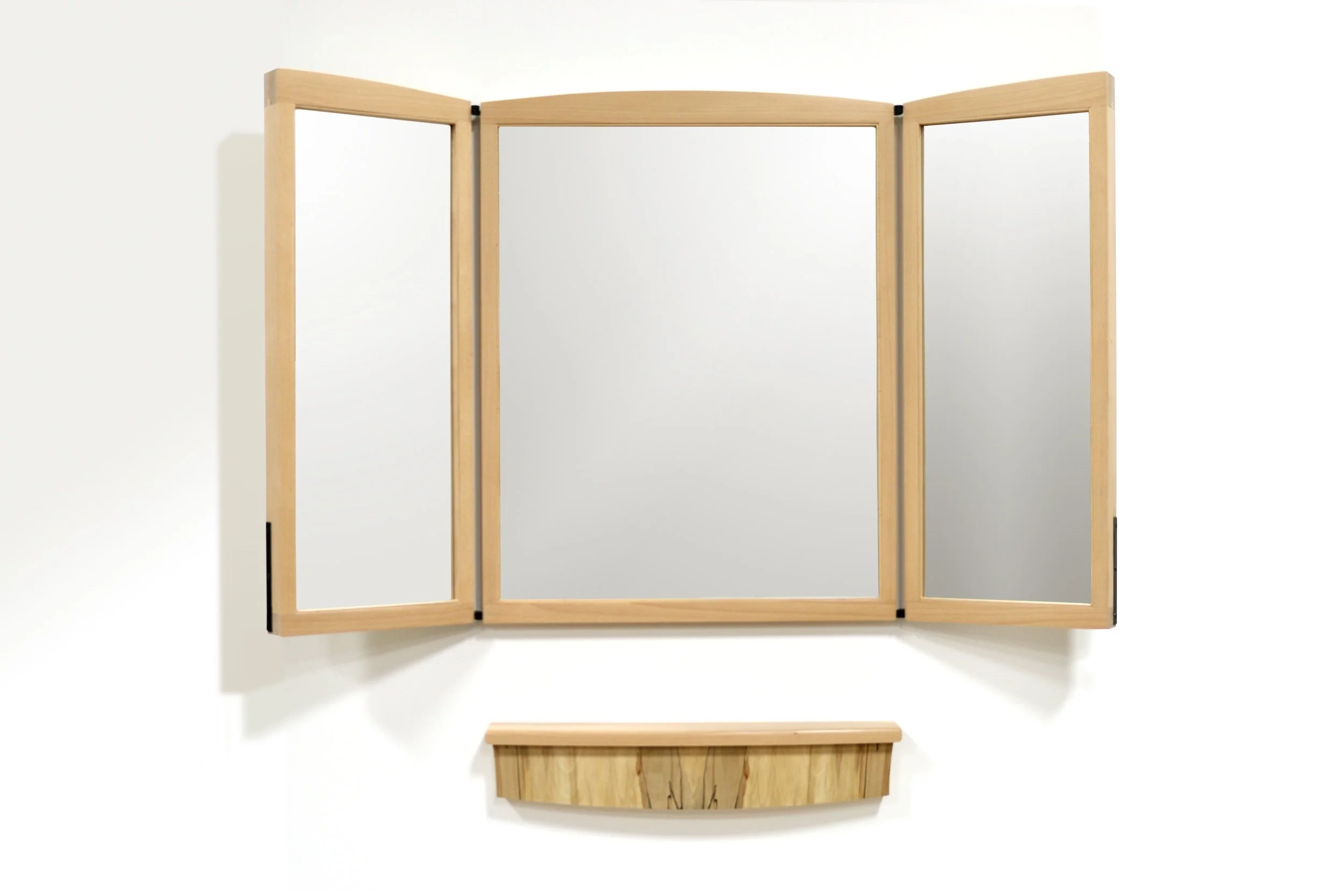 This tri-fold wall mirror and its companion lower shelf are made of spalted beach. The colors and patterns in spalting are the result of decay and fungal attack. Spalted wood refers to any wood that has undergone a natural transformation caused by fungi, resulting in unique decorative patterns like dark "zone lines" and color variations. There are typically two main visual elements in spalted wood, zone lines and white rot. Zone lines are the signature black, wavy lines that form at the boundaries where different fungal colonies meet and build defensive walls against each other. White rot is caused when fungi consumes the wood’s lignin, effectively bleaching certain areas of the wood to a lighter color. As the wood decays, it’s important to harvest it before deterioration occurs and stabilize it afterward.